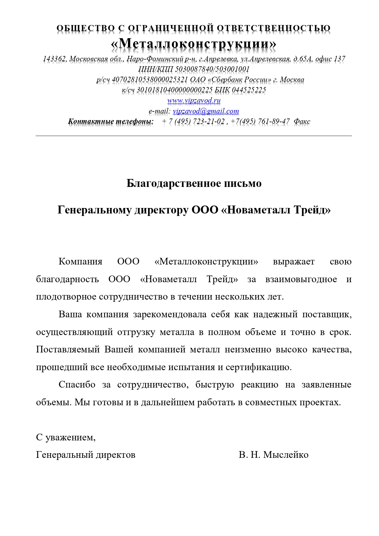 Компания ООО «Металлоконструкции» выражает свою благодарность ООО «Новаметалл Трейд» за взаимовыгодное и плодотворное сотрудничество в течении нескольких лет.