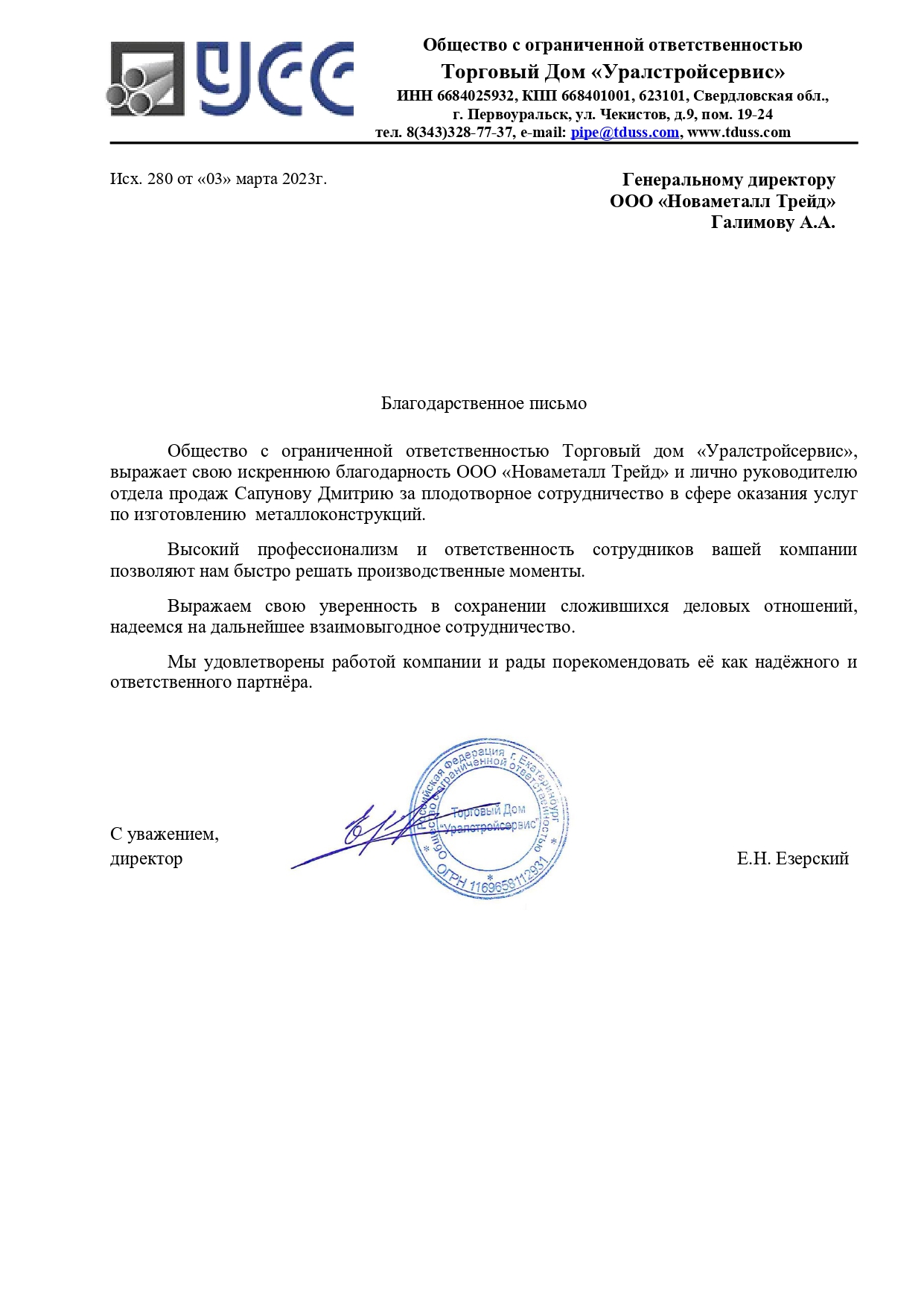 Общество с ограниченной ответственностью Торговый дом «Уралстройсервис», выражает свою искреннюю благодарность ООО «Новаметалл Трейд» и лично руководителю отдела продаж Сапунову Дмитрию за плодотворное сотрудничество в сфере оказания услуг по изготовлению металлоконструкций.