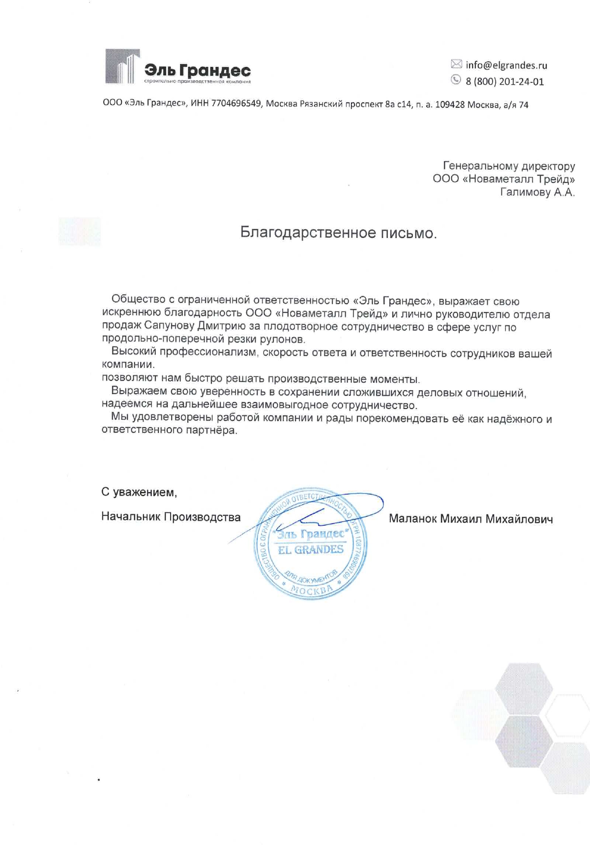 Общество с ограниченной ответственностью «Эль Грандес», выражает свою искреннюю благодарность ООО «Новаметалл Трейд» и лично руководителю отдела продаж Сапунову Дмитрию за плодотворное сотрудничество в сфере услуг по продольно-поперечной резки рулонов.