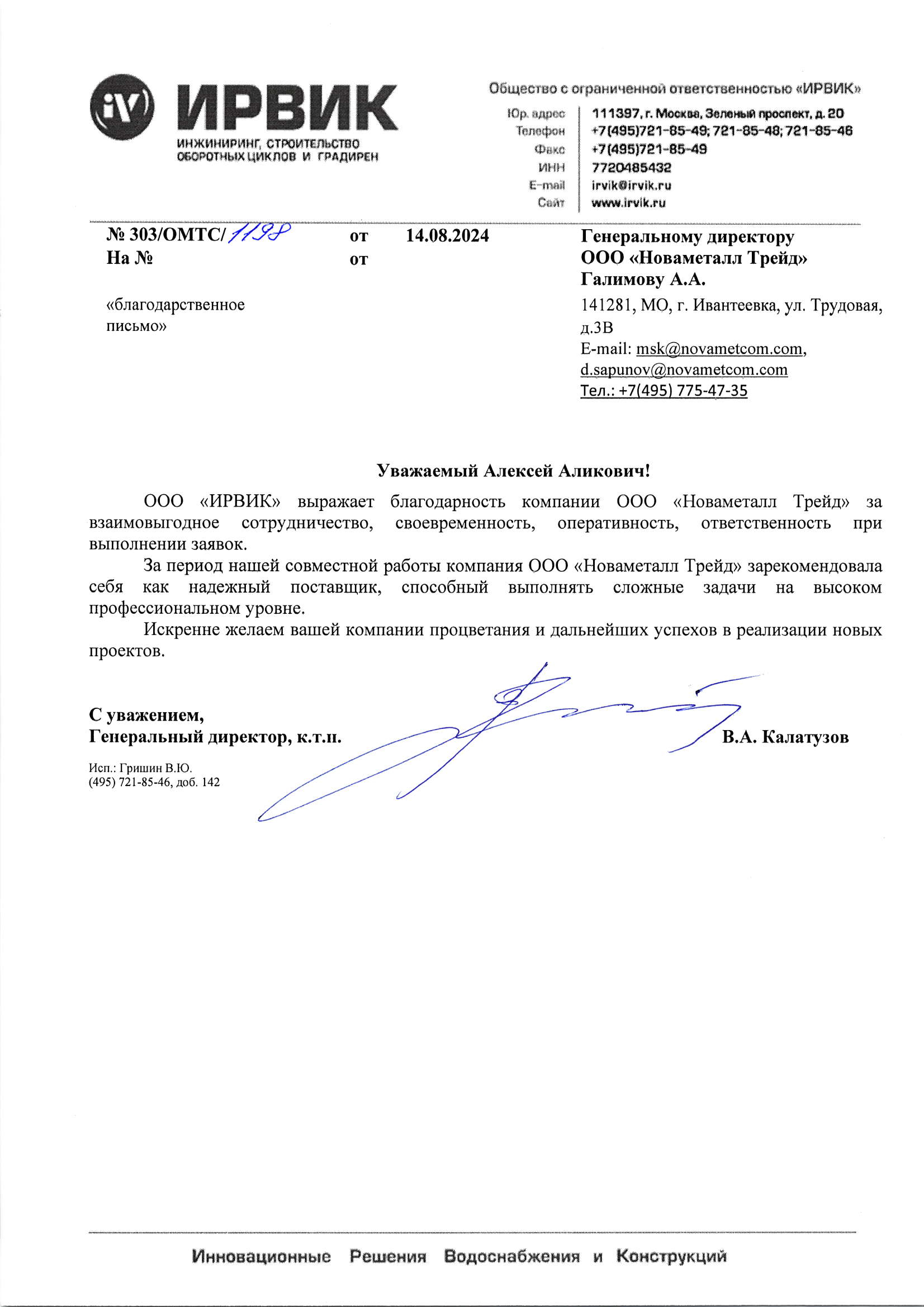 ООО «ИРВИК» выражает благодарность компании ООО «Новаметалл Трейд» за взаимовыгодное сотрудничество, своевременность, оперативность, ответственность при выполнении заявок.